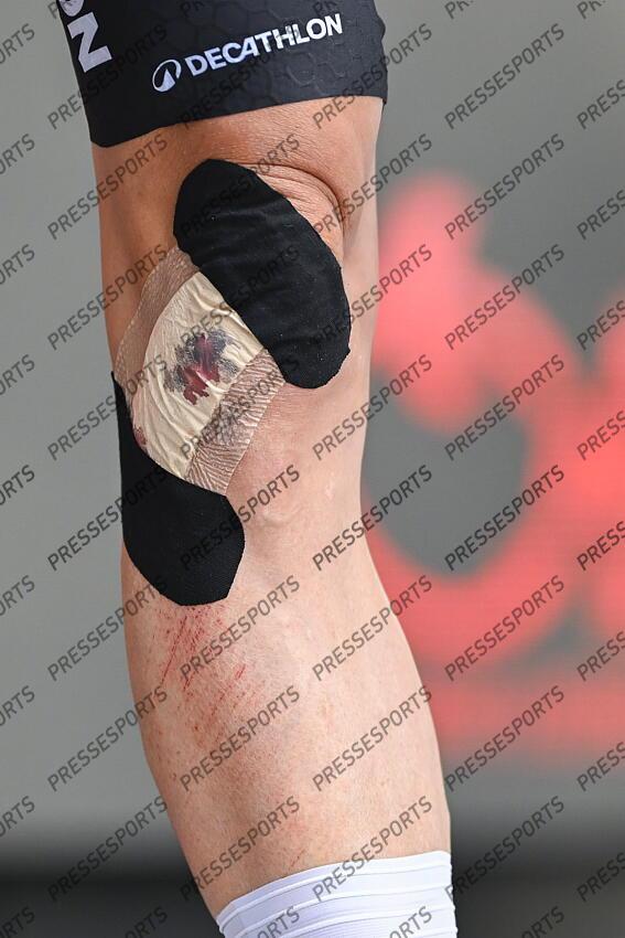 KUURNE, BELGIUM - MARCH 01 : Illustration picture showing the injury on the leg of Naesen Oliver (BEL) of Decathlon CMA CGM Team during the 78th edition of Kuurne Brussel Kuurne an UCI ProSeries 1.Pro one day cycling road race for Men Elite of 194 km with start in Kortrijk and finish in Kuurne on March 1, 2026 in Kuurne, Belgium, 01/03/2026 ( Motordriver Kenny Verfaillie - Photo by Nico Vereecken / Photonews KUURNE-BRUXELLES-KUURNE