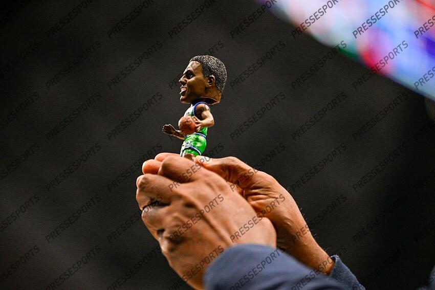 Jan 12, 2026; Dallas, Texas, USA; Former Dallas Mavericks player Rolando Blackman holds his bobblehead during the second quarter between the Dallas Mavericks and the Brooklyn Nets at the American Airlines Center. Mandatory Credit: Jerome Miron-Imagn Images NBA: Brooklyn Nets at Dallas Mavericks