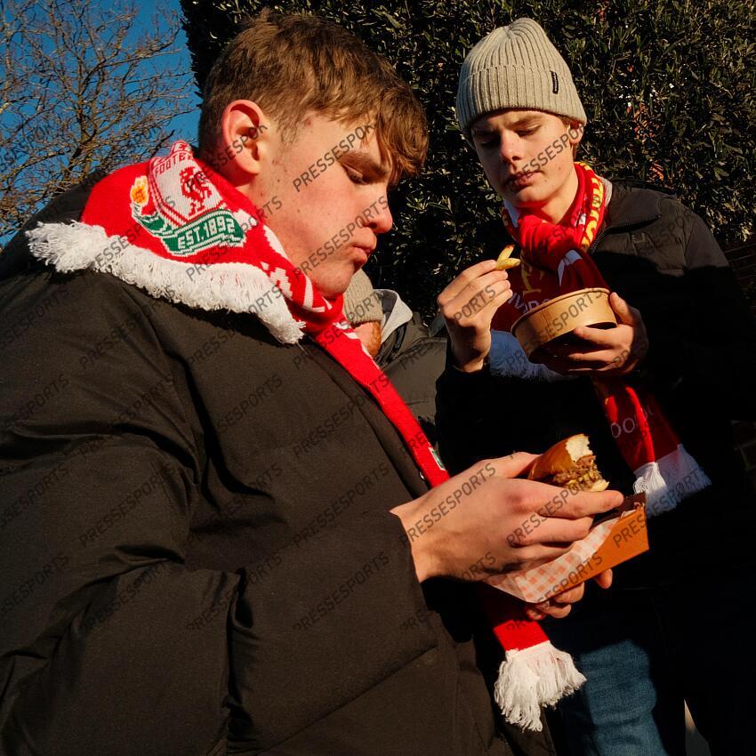 04 January 2026, London - Premier League Football - Fulham v Liverpool - Liverpool fans with food - Photo: Jacques Feeney / Offside. FULHAM-LIVERPOOL (2-2)