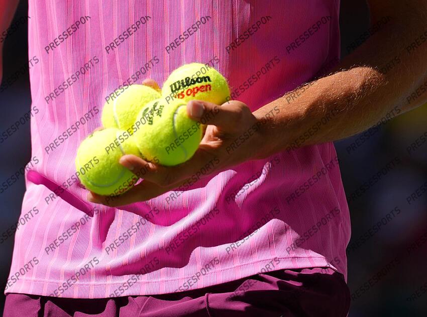 Aug 31, 2025; Flushing, NY, USA; Carlos Alcaraz (ESP) examines four balls prior to serving to Arthur Rinderknech (FRA) (not pictured) on day eight of the 2025 U.S. Open tennis tournament at the USTA Billie Jean King National Tennis Center. Mandatory Credit: Robert Deutsch-Imagn Images US OPEN