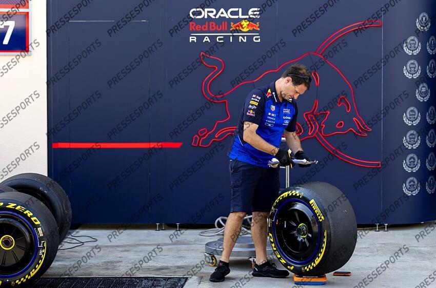 BAHRAIN - A Red Bull employee checks the Pirelli tires during the third day of testing at the Bahrain International Circuit before the start of the Formula 1 season. SANDER KONING / ANP TEST DE PRE-SAISON 3EME JOURNEE