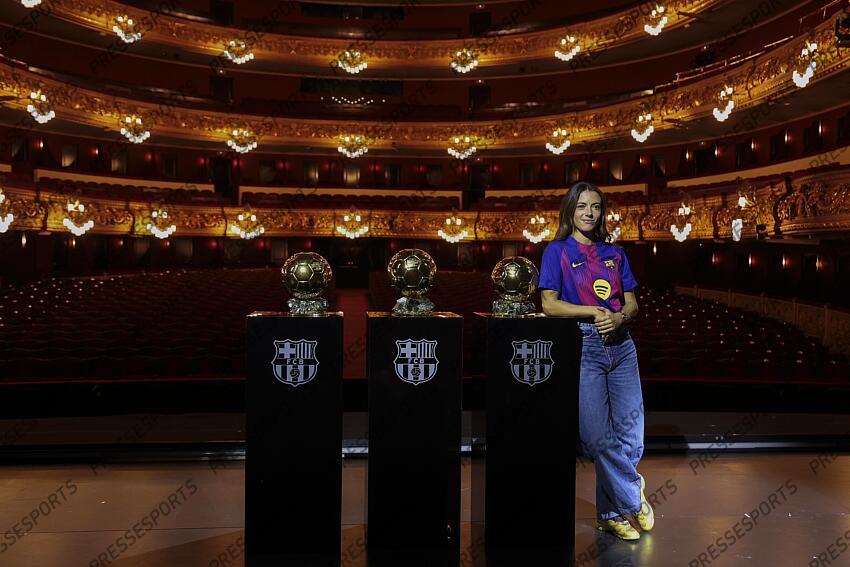 Aitana Bonmati of FC Barcelona poses with her three Ballon d'Or awards at the Gran Teatre del Liceu on September 25, 2025 in Barcelona, Spain. AITANA BONMATI POSE AVEC SES TROIS BALLONS D'OR