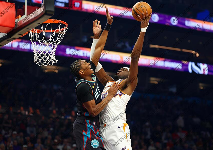 Jan 29, 2026; Phoenix, Arizona, USA; Phoenix Suns center Mark Williams (right) drives to the basket against Detroit Pistons forward Wendell Moore Jr. in the first half at Mortgage Matchup Center. Mandatory Credit: Mark J. Rebilas-Imagn Images NBA: Detroit Pistons at Phoenix Suns