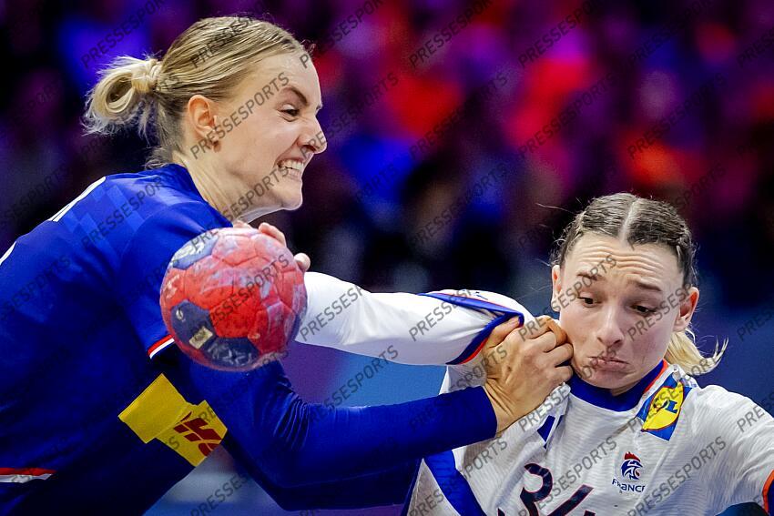ROTTERDAM - Kelly Dulfer (NED) and Léna Grandveau (FRA) during the group match between France and the Netherlands in the main round of the World Handball Championship in Ahoy Rotterdam. ANP ROBIN VAN LONKHUIJSEN FRANCE-PAYS BAS (23-26)