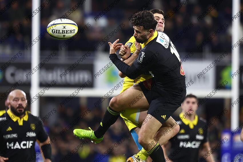 RUGBY TOP 14 2026 CLERMONT - LA ROCHELLE STADE MARCEL MICHELIN CLERMONT FERRAND FRANCE 25/01/2026 La Rochelle's French fly-half Antoine Hastoy Clermont’s Argentinian wing Bautista Delguy CLERMONT-LA ROCHELLE