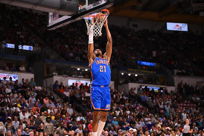 Oct 5, 2025; North Charleston, South Carolina, USA; Oklahoma City Thunder guard Aaron Wiggins (21) dunks against the Charlotte Hornets in the first quarter at North Charleston Coliseum. Mandatory Credit: Arthur Ellis-Imagn Images NBA: Preseason-Oklahoma City Thunder at Charlotte Hornets