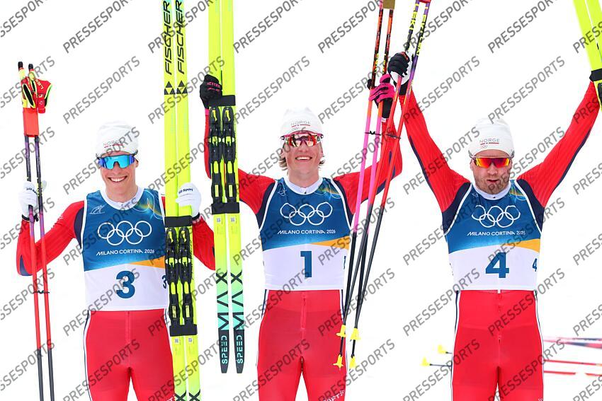 (L-R) NYENGET Martin Loewstroem, KLAEBO Johannes Hoesflot, IVERSEN Emil (NOR), FEBRUARY 21, 2026 - Cross-Country Skiing : Men's 50km Mass Start Classic during the Milano Cortina 2026 Olympic Winter Games at Tesero Cross-Country Skiing Stadium in Tesero, Italy. (Photo by Yohei Osada/AFLO SPORT) MASS START 50 KM CLASSIQUE HOMMES