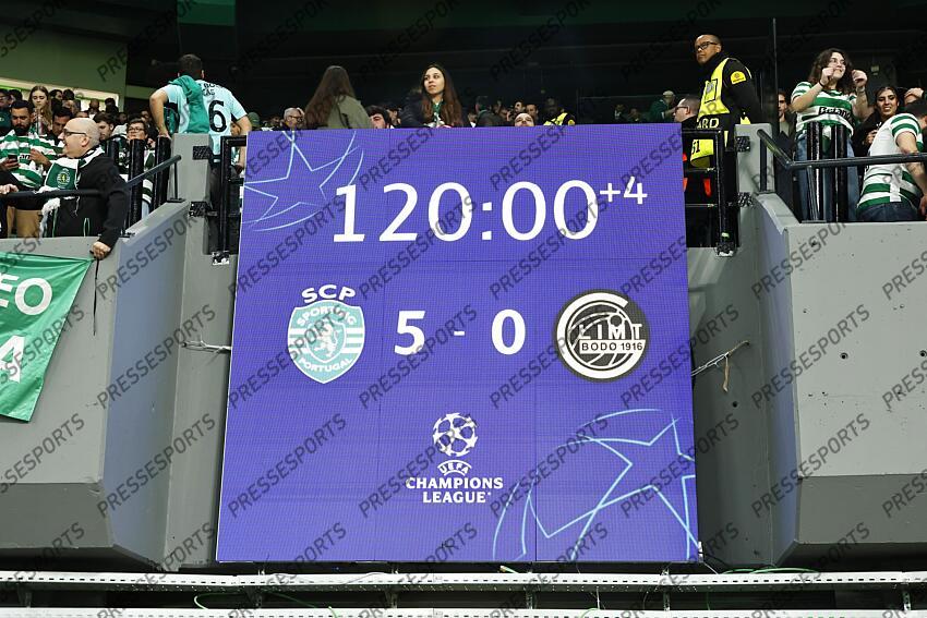 General view of Electronic signboard, MARCH 17, 2026 - Football / Soccer : Electronic scoreboard displaying match results after UEFA Champions League round of 16 2nd leg match between Sporting Clube de Portugal - FK Bodo/Glimt at the Estadio Jose Alvalade in Lisbon, Portugal. (Photo by Mutsu Kawamori/AFLO) SPORTING PORTUGAL-BODO/GLIMT (5-0 A.P)