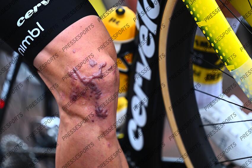 HAACHT, BELGIUM - SEPTEMBER 20 : Illustration picture shows the knee of Van Aert Wout (BEL) of Team Visma - Lease a Bike during the 27th edition of Super 8 Classic an UCI ProSeries 1.Pro one day cycling road race for Men Elite of 198.9 km with start in Brakel and finish in Haacht on September 20, 2025 in Haacht, Belgium, 20/09/2025 ( Motordriver Rodrique Verfaillie - Photo by Gregory Van Gansen / Photonews SUPER 8 CLASSIC