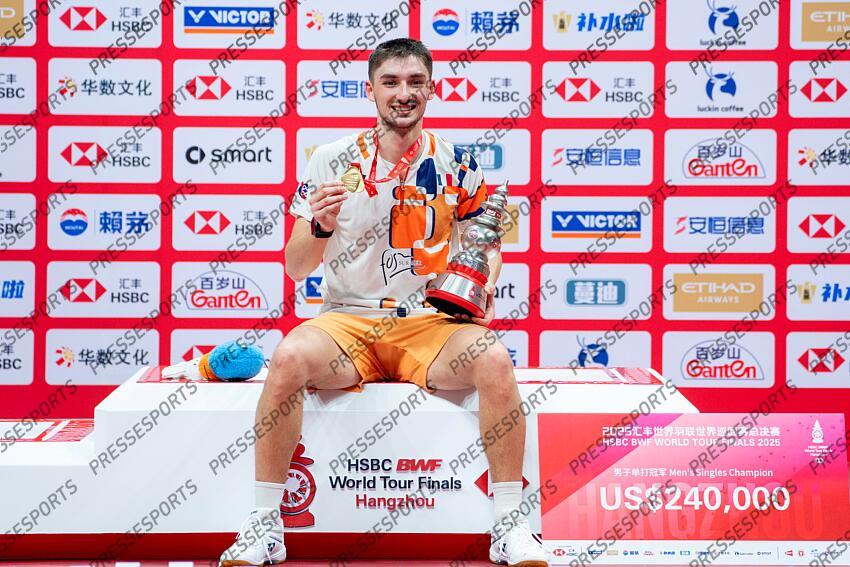 HANGZHOU, CHINA - DECEMBER 21: Champion Christo Popov of France celebrates on the podium after winning the Men s Singles Final match against Shi Yuqi of China on day 5 of the BWF World Tour Finals 2025 at Hangzhou Olympic Sports Centre Gymnasium on December 21, 2025 in Hangzhou, Zhejiang Province of China. PUBLICATIONxNOTxINxCHN Copyright: xVCGx 111611292543 HANGZHOU, CHINA - DECEMBER 21: Champion Christo Popov of France celebrates on the podium after winning the Men s Singles