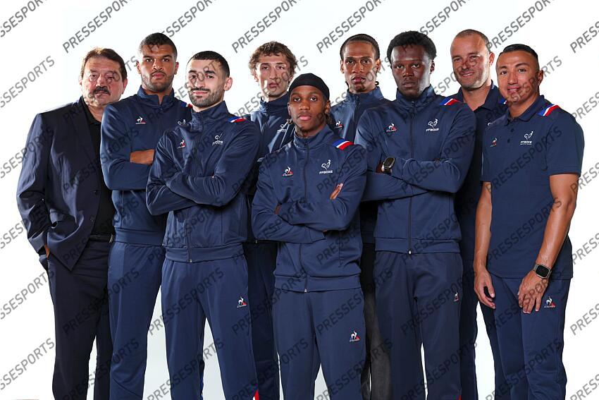 de gauche a droite nato (dominique) (fra) pdt FFBoxe bouafia (soheb) (fra) hamraoui (lounes) (fra) grau (hugo) (fra) hippocrate (christopher) (fra) yojerlin (cesar) (fra) makam (traore) (fra) nichane (mehdi) (fra) DTN FFBoxe hasni (kamel) (fra) coach BOXE BOXE ANGLAISE 2025 PRESENTATION EQUIPE DE FRANCE INSEP PARIS FRANCE 02/09/2025 BOULANGER DENIS/PRESSE SPORTS