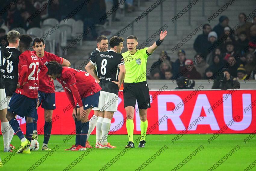 eggestein (maximilian) sylwestrzak (damian) FOOT LIGUE EUROPA 2026 LILLE-FRIBOURG (1-0) STADE PIERRE MAUROY VILLENEUVE D'ASCQ FRANCE 29/01/2026 PAPON BERNARD carton rouge à eggestein à la 74e min arbitre polonais