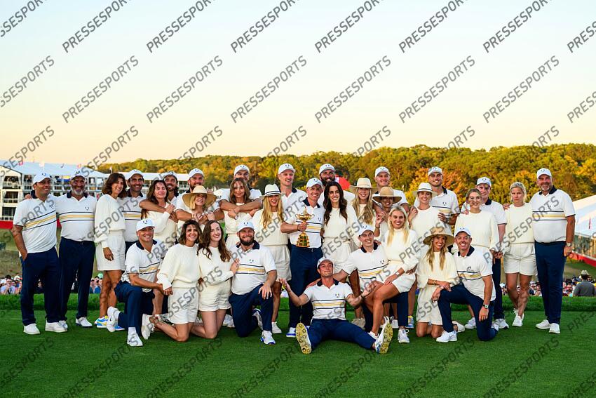 250928 Tommy Fleetwood, Shane Lowry, Rasmus Højgaard, Justin Rose, Team Captain Luke Donald, Jon Rahm, Sepp Straka, Ludvig Åberg, Rory McIlroy, Robert MacIntyre, Tyrrell Hatton, Matt Fitzpatrick and Viktor Hovland of Team Europe together with their partners celebrate after winning the Ryder Cup on day 3 of the Ryder Cup on September 28, 2025 in New York. Photo: Jesper Zerman / BILDBYRÅN / kod JZ / JZ0619 golf ryder cup day 3 bbeng jubel FINAL DAY SIMPLES
