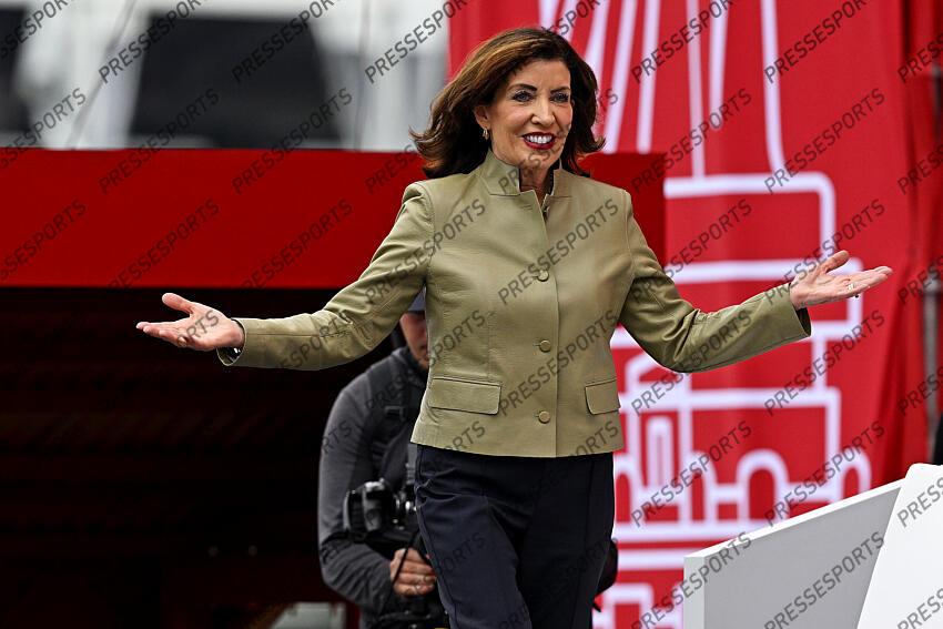 Sep 24, 2025; Bethpage, New York, USA; New York governor Kathy Hochul during the opening ceremony of the Ryder Cup golf tournament at Bethpage Black. Mandatory Credit: Dennis Schneidler-Imagn Images CEREMONIE D'OUVERTURE
