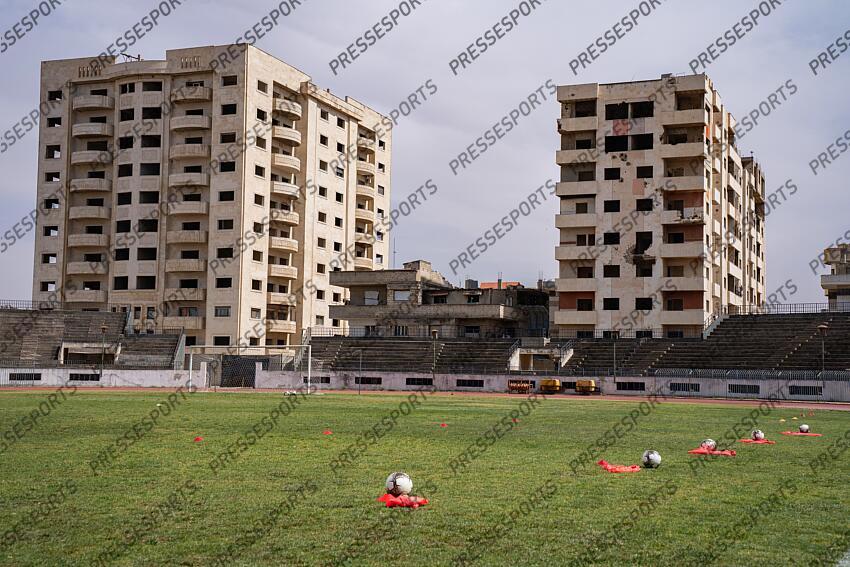 FOOT MAGAZINE SYRIE 2025 MAGAZINE AL WAHDA STADE BABA OMAR Homs SYRIE 26/05/2025 CUAU CHARLES Match de championnat entre Al Wahda et le club de Tishreen. Victoire 2-1 d’Al Wahda. 1h30 avant le match, pendant l’échauffement. En arrière plan, les bâtiments portent encore les stigmates de la guerre civile. - Attention image soumise a conditions particulieres, nous contacter avant toute utilisation -