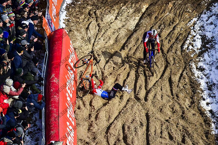 ZONHOVEN, BELGIUM - JANUARY 04 : Pieterse Puck (NED) of Fenix - Deceuninck in a crash and Brand Lucinda (NED) of Baloise Glowi Lions in action during the 9th leg of the Zonhoven UCI Cyclocross World Cup 2025-2026 a cyclocross race for Women Elite on January 4, 2026 in Zonhoven, Belgium, 04/01/2026 (Photo by Peter De Voecht / Photonews UCI Cyclocross World Cup 2025-2026 Zonhoven