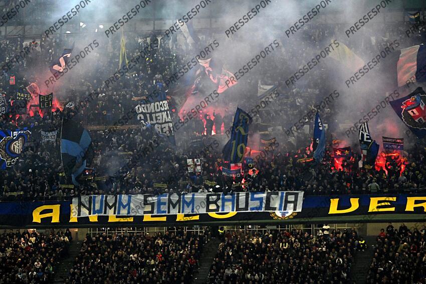 Foto IPP/Paolo Bona Milano 08/03/2026 Campionato Serie A di Calcio stagione 2025/2026 partita Milan-Inter Nella foto uno striscione dei tifosi dell'Inter cn la scritta " Numm semm bauscia " un'espressione in dialetto milanese in italiano "Noi siamo bauscia" che significa persona sbruffona, fanfarona, che si dà delle arie e presuntuosa. "Noi siamo bauscia" Italy Photo Press Worldwide Copyright AC MILAN-INTER MILAN (1-0)