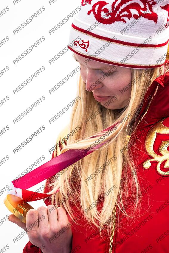 260309 Varvara Voronchikhina of Russia with her Paralympic gold medal at the medal ceremony for the women's Super-G para alpine skiing during day 3 of the Milano Cortina 2026 Winter Paralympic Games on March 9, 2026 in Cortina. Photo: Maxim Thoré / BILDBYRÅN / kod MT / MT1013 alpint alpine skiing paralympic games paralympics paralympiska spel paralympiske leker vinter-paralympics winter paralympics milano cortina 2026 milano cortina 2026 winter paralympic games 3 bbeng dam super-g ryssland SUPER G FEMMES