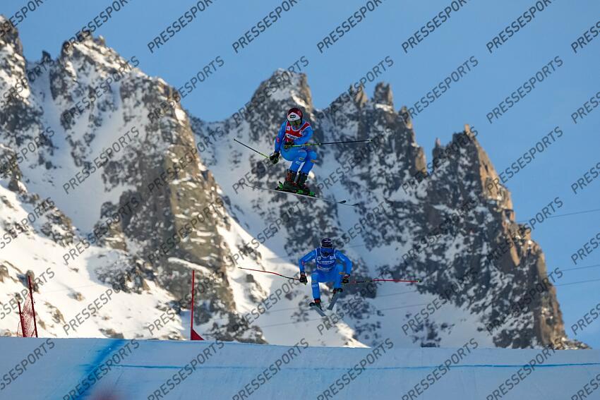 VAL THORENS, FRANCE - DECEMBER 11: Simone Deromedis of Team Italy, Edoardo Zorzi of Team Italy in action during the FIS Ski Cross World Cup Men's and Women's Ski Cross on December 11, 2025 in Val Thorens, France. (Photo by Millo Moravski/Agence Zoom) COURSES VAL THORENS