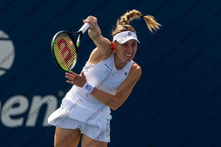 Aug 27, 2025; Flushing, NY, USA; Ekaterina Alexandrova of Russia serves against Wang Xinyu of China in the second round of the women’s singles at the US Open at Billie Jean King National Tennis Center. Mandatory Credit: Mike Frey-Imagn Images US OPEN