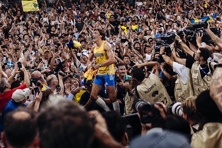 Duplantis (Armand) - (sue) - ATHLETISME CHPTS DU MONDE 2025 2025 15.09.2025. Championnat du monde d’athlétisme de Tokyo, Japon. Armand « Mondo » DUPLANTIS (SUE) célèbre son titre de champion du monde de saut à la perche avec le public et son nouveau record du monde, ayant effacé une barre à 6,30 m, améliorant d’un centimètre sa propre marque mondiale. SAUT A LA PERCHE HOMMES STADE OLYMPIQUE NATIONAL TOKYO JAPON 15/09/2025 Photo Gaelle Mobuchon Prix Richard Martin 2025