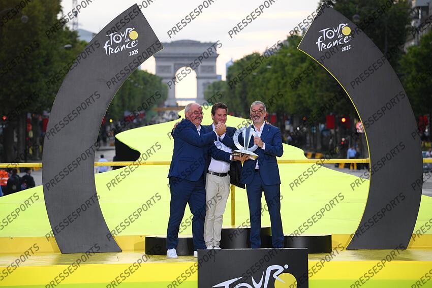 poiret (christian) a legender collboni (jaume) CYCLISME TOUR DE FRANCE 2025 2025 MANTES-LA-VILLE/PARIS CHAMPS-ELYSEES FRANCE 27/07/2025 PAPON BERNARD passage de temoin entre les villes du grand Depart Lille et Barcelone poiret: president du conseil departemental du Nord collboni: maire de Barcelone (alcalde de Barcelona)