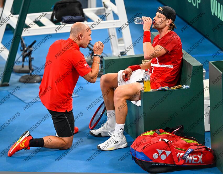Steve Darcis (L) coach of Belgium discuss tactics with Zizou Bergs (R) of Belgium during the 2025 Davis Cup Qualifier second round match between Australia and Belgium at Ken Rosewall Arena on September 14, 2025 in Sydney, Australia. (Photo by Izhar Khan) RESTRICTED TO EDITORIAL USE. STRICTLY NO COMMERCIAL USE AUSTRALIE VS BELGIQUE (2-3)