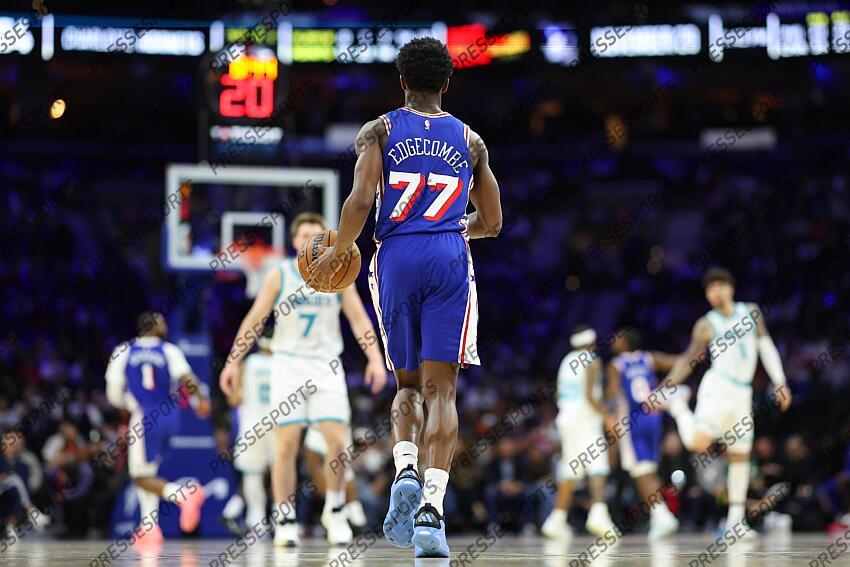 Oct 25, 2025; Philadelphia, Pennsylvania, USA; Philadelphia 76ers guard VJ Edgecombe (77) dribbles up court against the Charlotte Hornets during the fourth quarter at Xfinity Mobile Arena. Mandatory Credit: Bill Streicher-Imagn Images NBA: Charlotte Hornets at Philadelphia 76ers