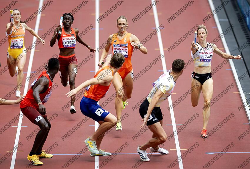 TOKYO – Lieke Klaver and Jonas Phijffers compete in the 4x400-meter mixed relay at the World Athletics Championships in the Japan National Stadium. ANP ROBIN VAN LONKHUIJSEN CHAMPIONNATS DU MONDE D'ATHLETISME A TOKYO