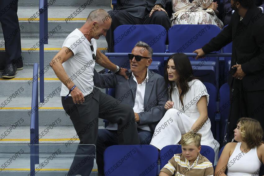 Sep 7, 2025; Flushing, NY, USA; Sting climbs over Bruce Springsteen to get to his seat prior to the final of mens singles at Billie Jean King National Tennis Center. Mandatory Credit: Mike Frey-Imagn Images ALCARAZ/SINNER