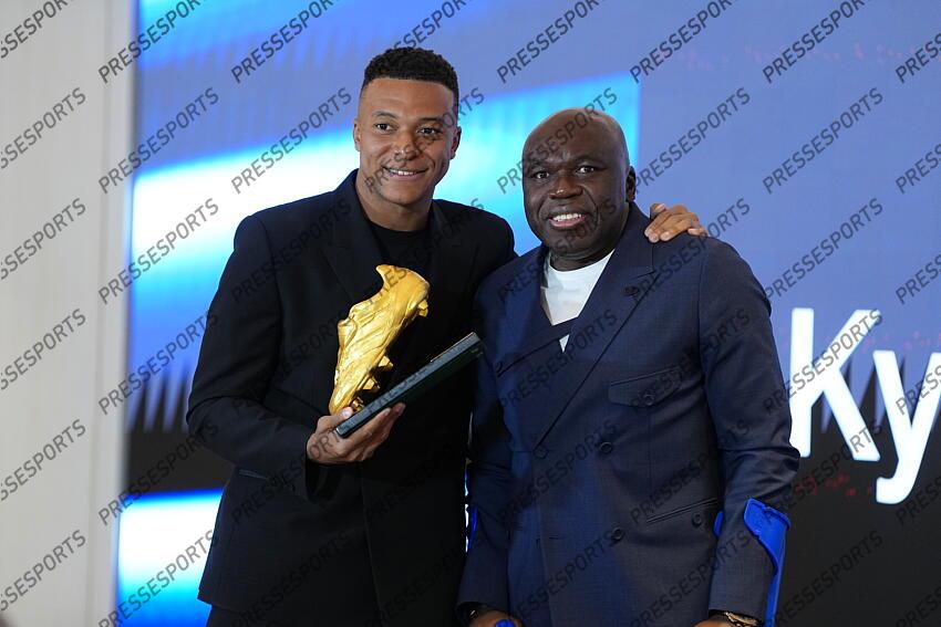 Kylian Mbappe poses for photo with his father Wilfried Mbappe during the presentation of the 2024–2025 Golden Boot to Kylian Mbappe in the VIP box at the Santiago Bernabeu Stadium on October 31, 2025 in Madrid, Spain. Vainqueur du Soulier d'or europeen pour la saison 2024-2025, Kylian Mbappe a reçu sa recompense lors d'une ceremonie organisee au sein du stade Santiago-Bernabeu. MBAPPE RECOIT LE SOULIER D'OR