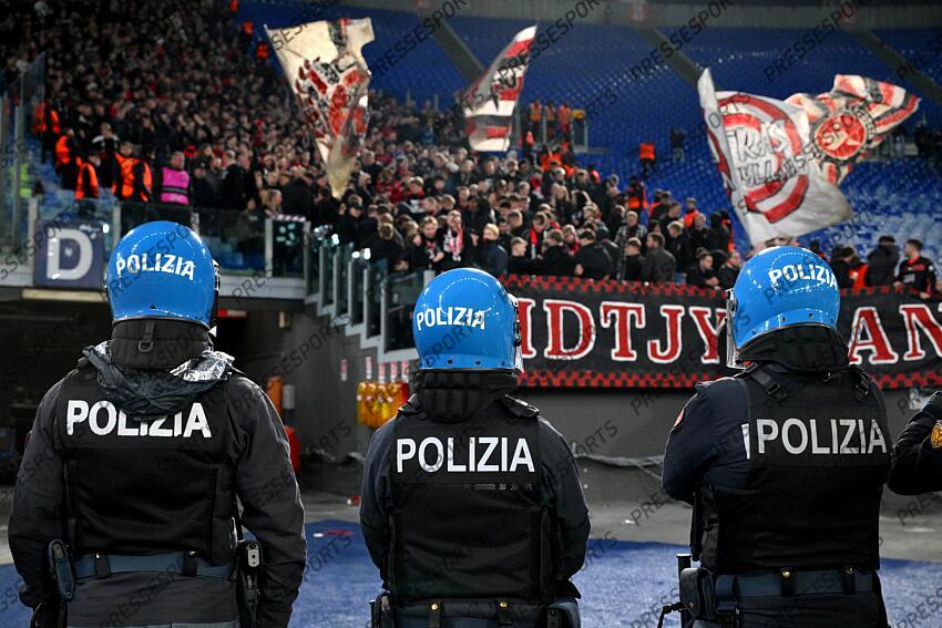 Foto IPP/Roberto Ramaccia Roma 27/11/2025 Calcio - Uefa Europa League 2025/2026 Roma vs Midtjylland Nella foto police deployed among the Midtjylland's fans Italy Photo Press - World Copyright AS ROME-FC MIDTJYLLAND (2-1)