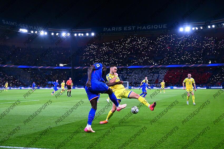 upamecano (dayot) hutsuliak (oleksii) FOOT ELIMINATOIRES COUPE DU MONDE 2026 2025 FRANCE-UKRAINE PARC DES PRINCES PARIS FRANCE 13/11/2025 FAUGERE FRANCK Lumieres des telephones portables à la 13e minute de jeu en hommage aux victimes des attentats du 13 novembre 2015 " paris est magique "