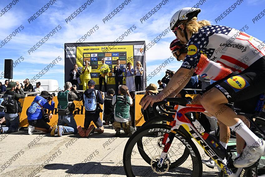 MONT-VENTOUX, FRANCE - JULY 22 : Pogacar Tadej (SLO) of UAE Team Emirates pictured with the yellow jersey during the podium ceremony of stage 16 of the 112th edition of Tour de France an UCI World Tour 2.UWT cycling road race stage for Men Elite of 172 km with start in Montpellier and finish in Mont-Ventoux on July 22, 2025 in Mont-Ventoux, France, 22/07/2025 ( Motordriver Kenny Verfaillie - Photo by Jan De Meuleneir / Photonews MONTPELLIER/MONT VENTOUX