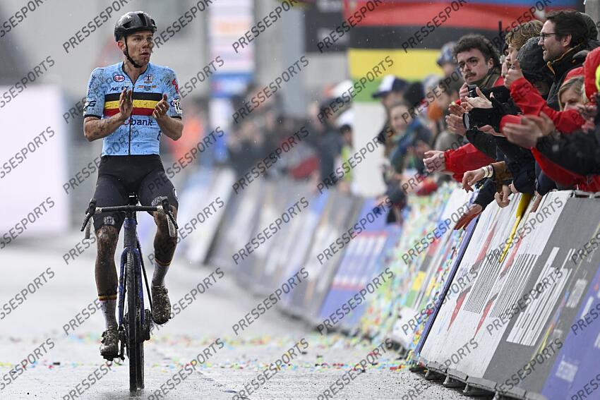 HULST, THE NETHERLANDS - FEBRUARY 01 : Nys Thibau (BEL) crosses the finish line exhausted after the 2026 UCI Cyclo-Cross World Championships for Men Elite on February 01, 2026 in Hulst, The Netherlands, 01/02/2026 ( Photo by Nico Vereecken / Photo News UCI World Championships 2026 Hulst