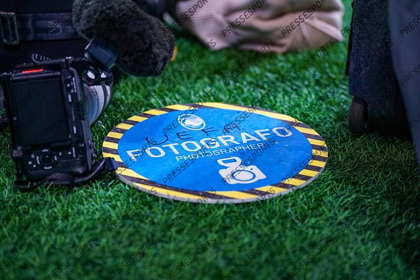 Italien: Fussball UEFA Champions League 2025 - 2026, Achtelfinale - Atalanta Bergamo vs FC Bayern München - New Balance Arena Bergamo: UEFA Fotografenposition, Fotoposition am Spielfeldrand, Fotografenplatz, Fotografie im Stadion, Kameraausrüstung, Kamera mit Teleobjektiv, Mikrofon, Medienarbeit, Sportfotografie, Pressefotograf, Medienbereich, Spielfeldrand, Rasen, Champions League Organisation, UEFA Branding, Fussballstadion, Sportevent Italy Football UEFA Champions League 2025 2026, Round of 16 Atalanta Bergamo vs FC Bayern Munich New Balance Arena Bergamo UEFA photographer position, photo position on the sidelines, photographer position, photography in the stadium, camera equipment, camera with telephoto lens, microphone, media relations, sports photography, press photographer, media area, sidelines, pitch, Champions League organization, UEFA branding, football stadium, sporting event Copyright: xJOERANxSTEINSIEKx ATALANTA BERGAME-BAYERN MUNICH (1-6)