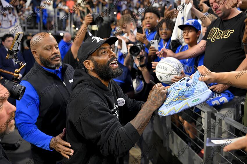 Oct 6, 2025; Fort Worth, Texas, USA; Dallas Mavericks guard Kyrie Irving (11) signs autographs for fans after the game against the Oklahoma City Thunder during the second half at Dickie's Arena. Mandatory Credit: Jerome Miron-Imagn Images NBA: Preseason-Oklahoma City Thunder at Dallas Mavericks