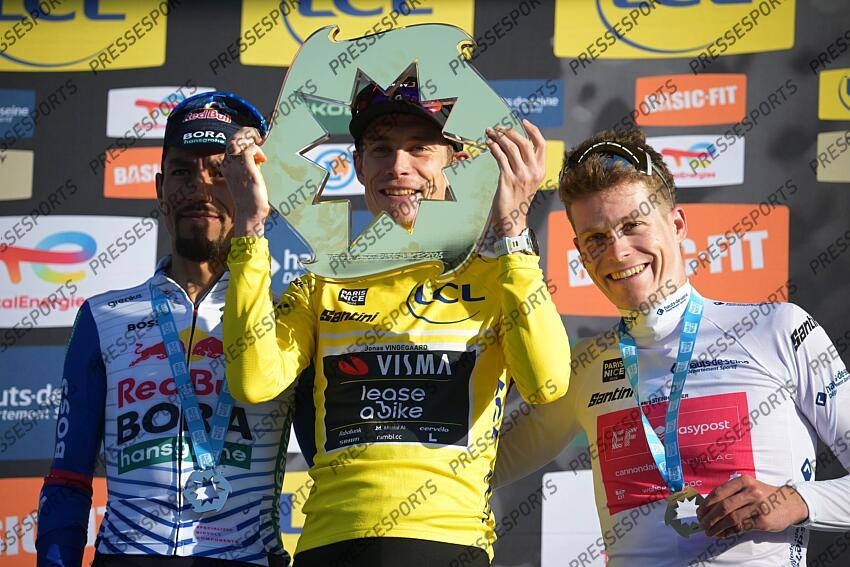 martinez poveda (daniel) - (col) - vingegaard (Jonas) - (DAN) - steinhauser (georg) - (ger) - CYCLISME PARIS/NICE 2026 NICE/NICE FRANCE 15/03/2026 PAPON BERNARD Podium Classement general