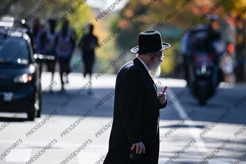 Nov 2, 2025; New York, NY, USA; A pedestrian crosses the street in Brooklyn as mens pro division runners approach during the 2025 TCS New York City Marathon. Mandatory Credit: John Jones-Imagn Images Running: New York City Marathon