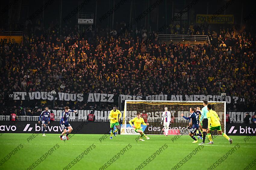 FOOT L1 2026 NANTES-LYON (0-1) STADE DE LA BEAUJOIRE NANTES FRANCE 07/02/2026 LAHALLE PIERRE banderole : " et vous avez pris quoi au mercato ?"