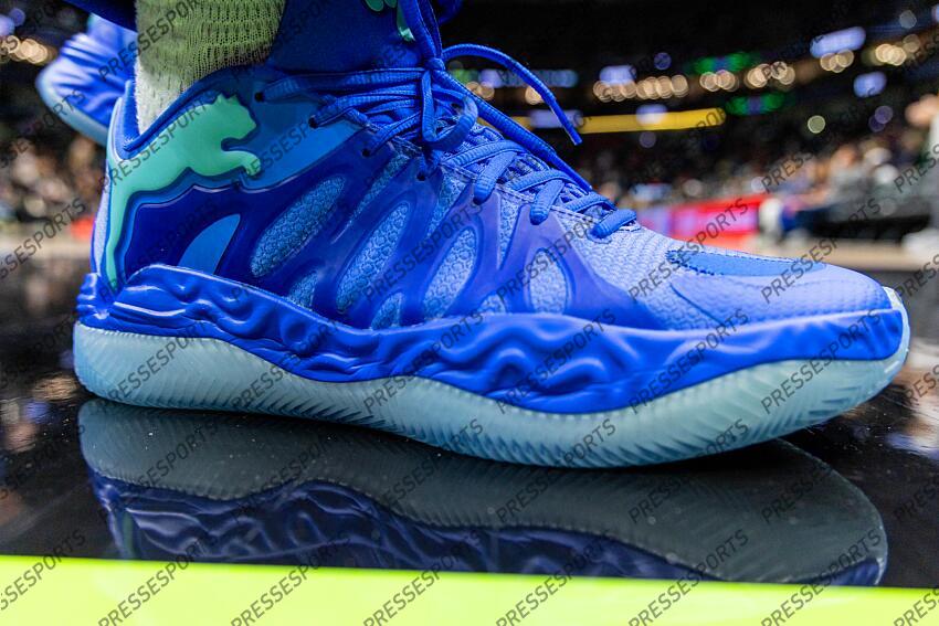 Dec 29, 2025; New Orleans, Louisiana, USA; Details view of the shoes worn by New York Knicks guard Tyler Kolek (13) against the New Orleans Pelicans during the first half at Smoothie King Center. Mandatory Credit: Stephen Lew-Imagn Images NBA: New York Knicks at New Orleans Pelicans NBA: New York Knicks at New Orleans Pelicans