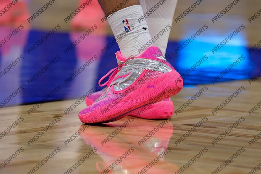 Feb 9, 2026; Orlando, Florida, USA; A detailed view of the shoes worn by Orlando Magic forward Noah Penda (93) during the game against the Milwaukee Bucks at Kia Center. Mandatory Credit: Mike Watters-Imagn Images NBA: Milwaukee Bucks at Orlando Magic