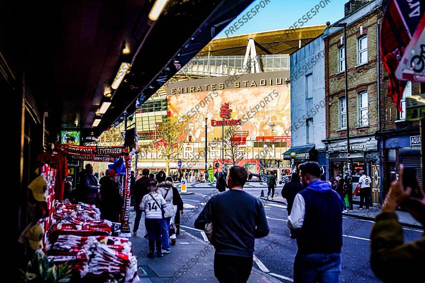 England: Fussball UEFA Champions League 2025 - 2026, Achtelfinale Rückspiel FC Arsenal London vs Bayer 04 Leverkusen - Emirates Stadium London: Matchday, Fußballfans, Fanartikel, Merchandising, Stadionumfeld, Anreise, Straßenleben, Urban Football Culture, Premier League, Europa Fußball, Sportevent, Atmosphäre, Spieltag, Crowd, London Streets, Soccer, international football, Champions League night England Football UEFA Champions League 2025 2026, Round of 16 second leg FC Arsenal London vs Bayer 04 Leverkusen Emirates Stadium London Matchday, soccer fans, merchandise, merchandising, stadium environment, arrival, street life, urban football culture, Premier League, European soccer, sporting event, atmosphere, matchday, crowd, London Streets, Soccer, international football, Champions League night Copyright: xJOERANxSTEINSIEKx ARSENAL-BAYER LEVERKUSEN (2-0)