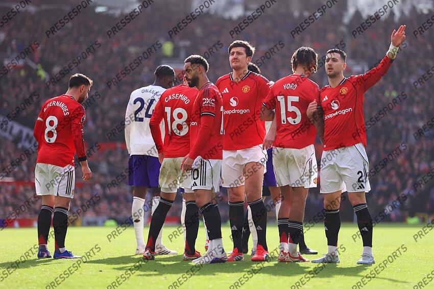15th March 2026 - Premier League - Manchester United v Aston Villa - Harry Maguire of Manchester United (C) and Diogo Dalot of Manchester United (R) organise the defensive wal - Photo: Simon Stacpoole / Offside. MANCHESTER UNITED-ASTON VILLA (3-1)