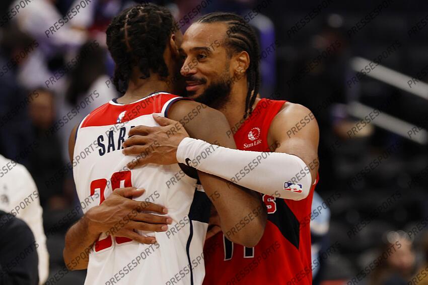 Oct 12, 2025; Washington, District of Columbia, USA; Toronto Raptors center Olivier Sarr (11) hugs his brother, Washington Wizards center Alex Sarr (20) after their game at Capital One Arena. Mandatory Credit: Geoff Burke-Imagn Images NBA: Preseason-Toronto Raptors at Washington Wizards