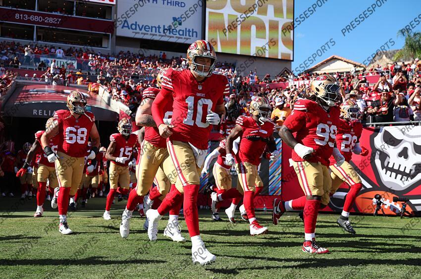 Oct 12, 2025; Tampa, Florida, USA; The San Francisco 49ers take the field prior to a game against the Tampa Bay Buccaneers at Raymond James Stadium. Mandatory Credit: Nathan Ray Seebeck-Imagn Images NFL: San Francisco 49ers at Tampa Bay Buccaneers