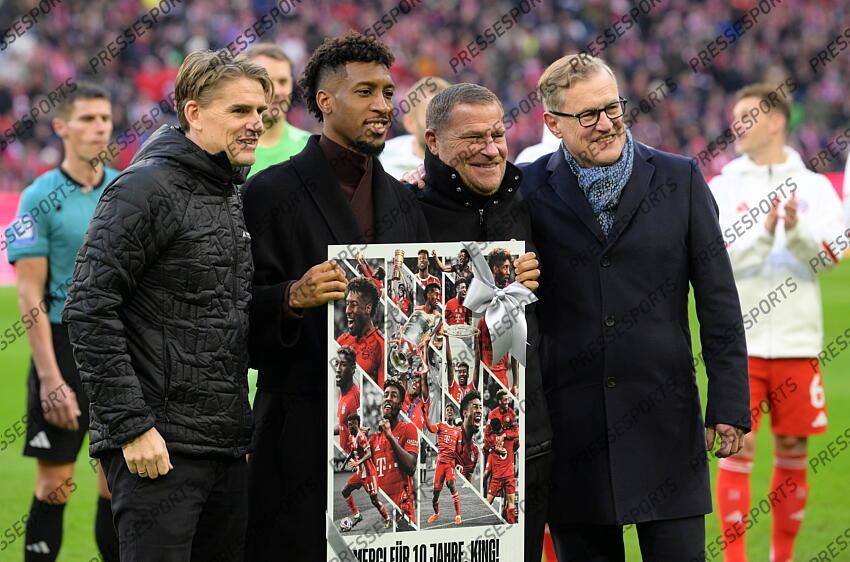 v.l. Sportdirektor Christoph Freund (Bayern), Verabschiedung Kingsley Coman (Frankreich, Al-Nassr FC), Sportvorstand Max Eberl (Bayern), Vorstandsvorsitzender Jan-Christian Dreesen (Bayern Muenchen) Muenchen, 29.11.2025, Fussball, Bundesliga, FC Bayern Muenchen - FC St. Pauli BAYERN MUNICH-SANKT PAULI (3-1)