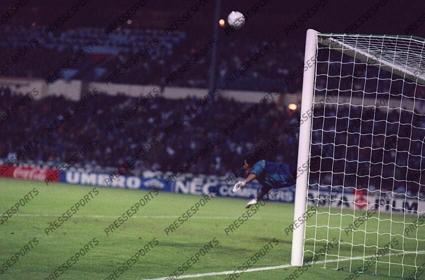 higuita (rene) le coup du scorpion FOOT MATCH AMICAL 1995 ANGLETERRE-COLOMBIE ANGLETERRE 06/09/1995 Mark Leech/OFFSIDE/PRESSE SPORTS 6/9/1995 Football International England v Columbia Rene Higuita does his famous scorpion kick Photo: Mark Leech / Offside