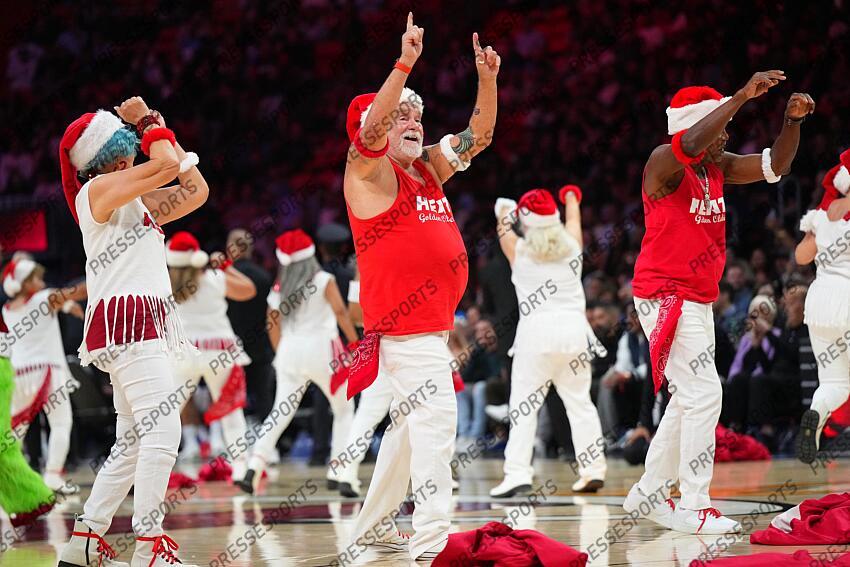 Dec 1, 2025; Miami, Florida, USA; The Miami Heat Golden Oldies perform during a second half break in the game against the Los Angeles Clippers at Kaseya Center. Mandatory Credit: Jim Rassol-Imagn Images NBA: Los Angeles Clippers at Miami Heat