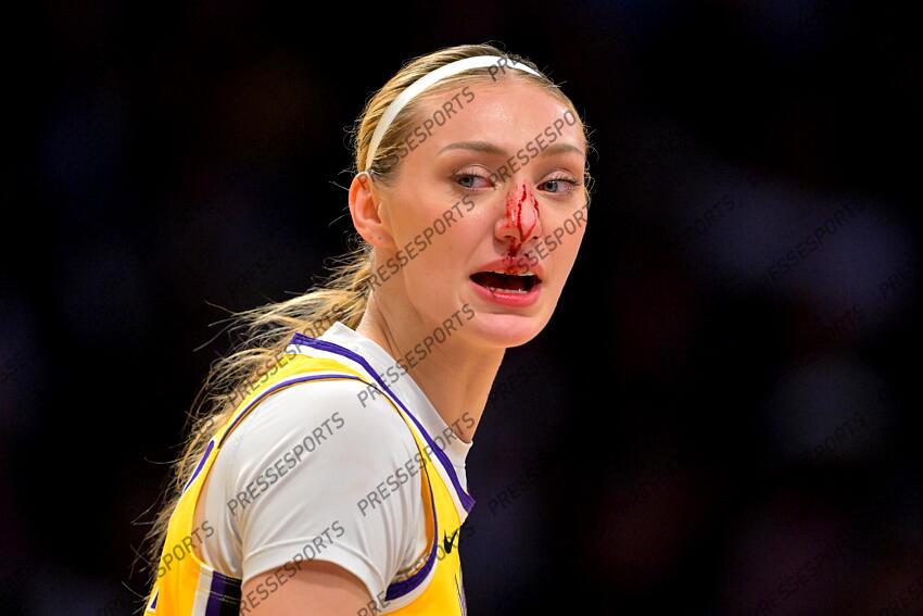 Sep 11, 2025; Los Angeles, California, USA; Los Angeles Sparks forward Cameron Brink (22) left the game with a bloddy nose after going for a rebound in the first half against the Las Vegas Aces at Crypto.com Arena. Mandatory Credit: Jayne Kamin-Oncea-Imagn Images WNBA: Las Vegas Aces at Los Angeles Sparks